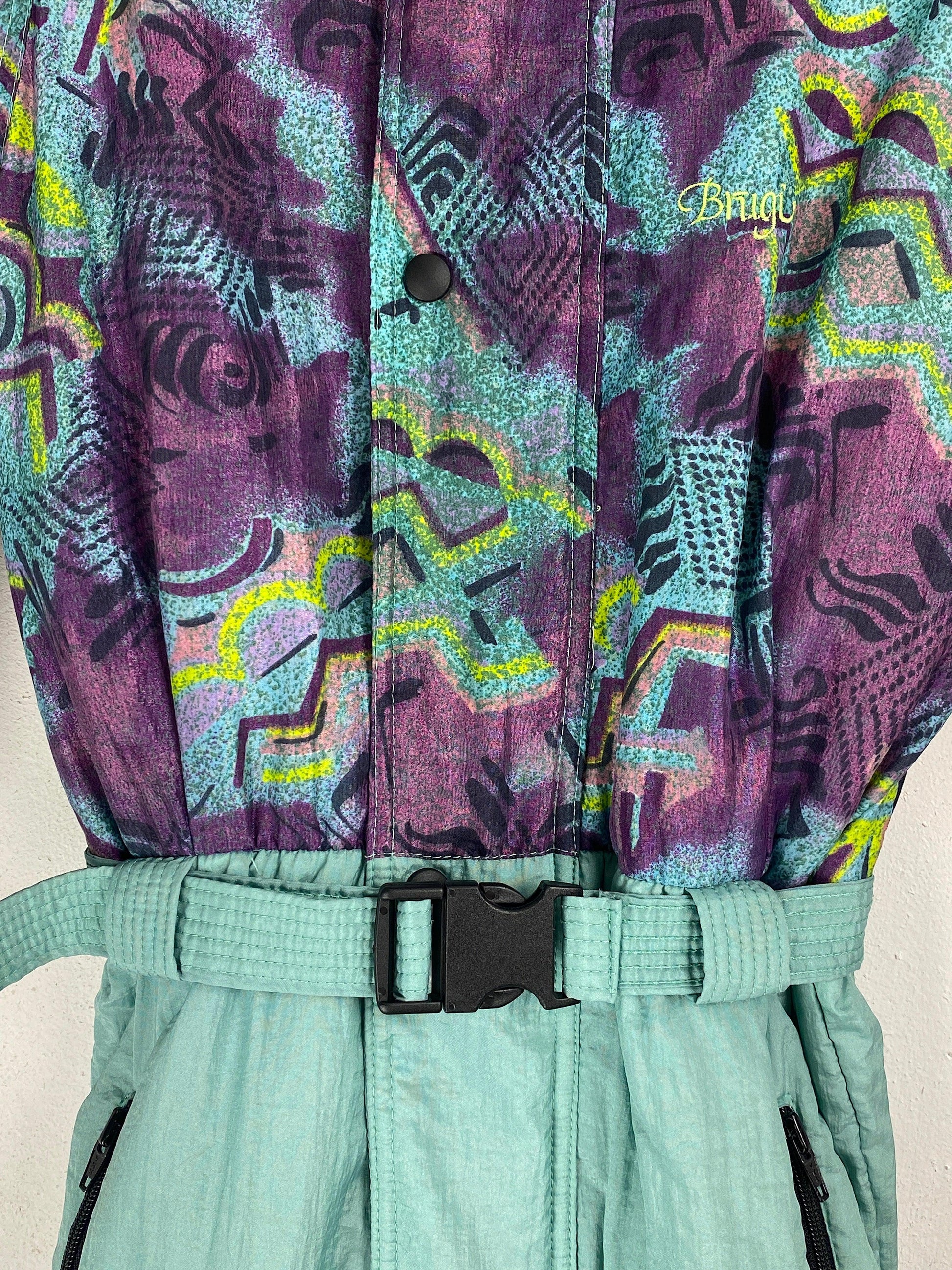 Retro-Skianzug für Kinder der bekannten Wintersportmarke Brugi mit einem typischen abstrakten Motiv der 80er Jahre. Zu öffnen mit Reißverschluss und Druckknöpfen. Gummizug an der Unterseite der Ärmel und Beine sowie in der Taille. Hoher Rollkragenpullover gegen die Kälte. Inklusive Originalband. Kapuze im Kragen. In einwandfreiem Zustand.