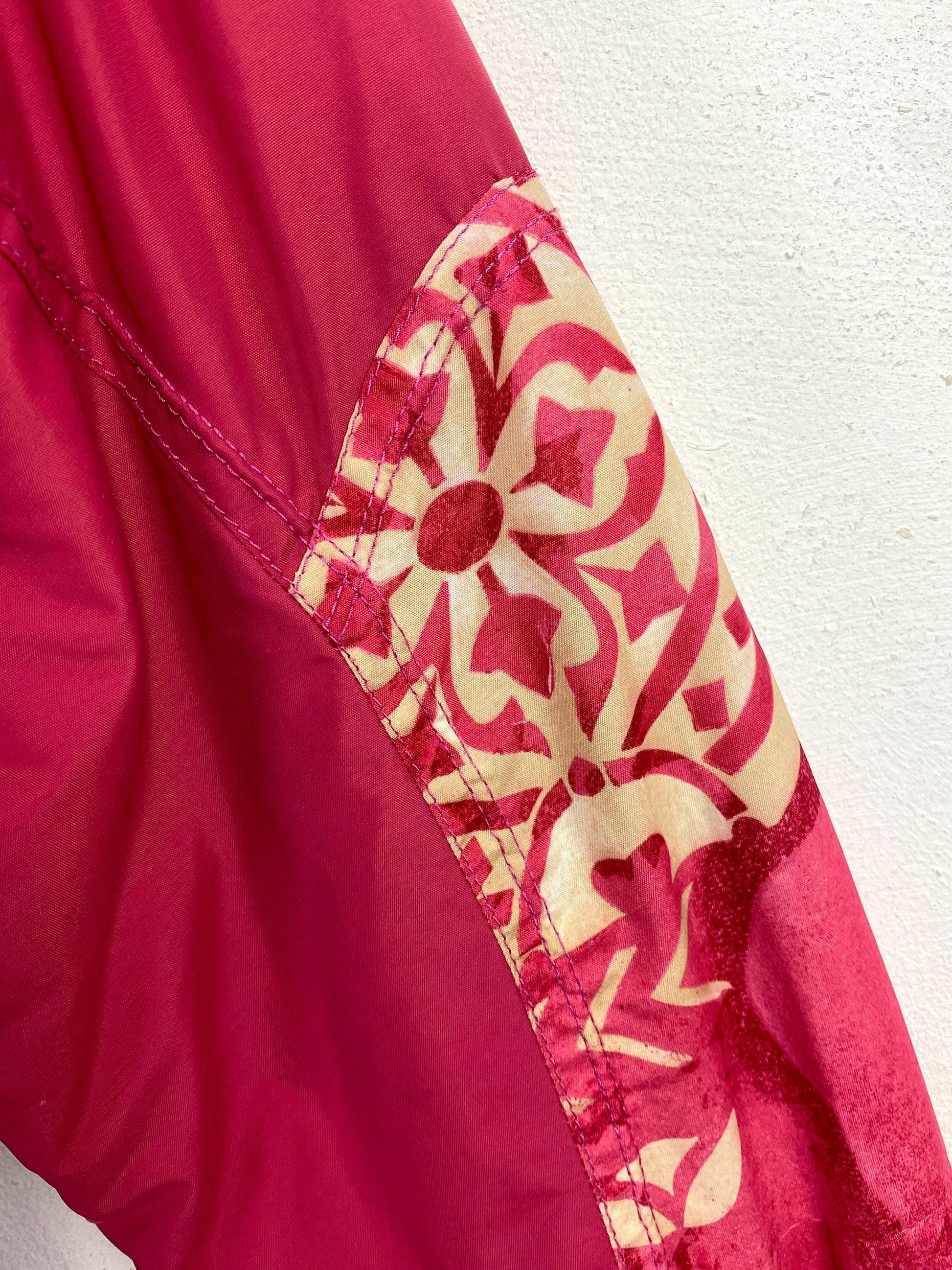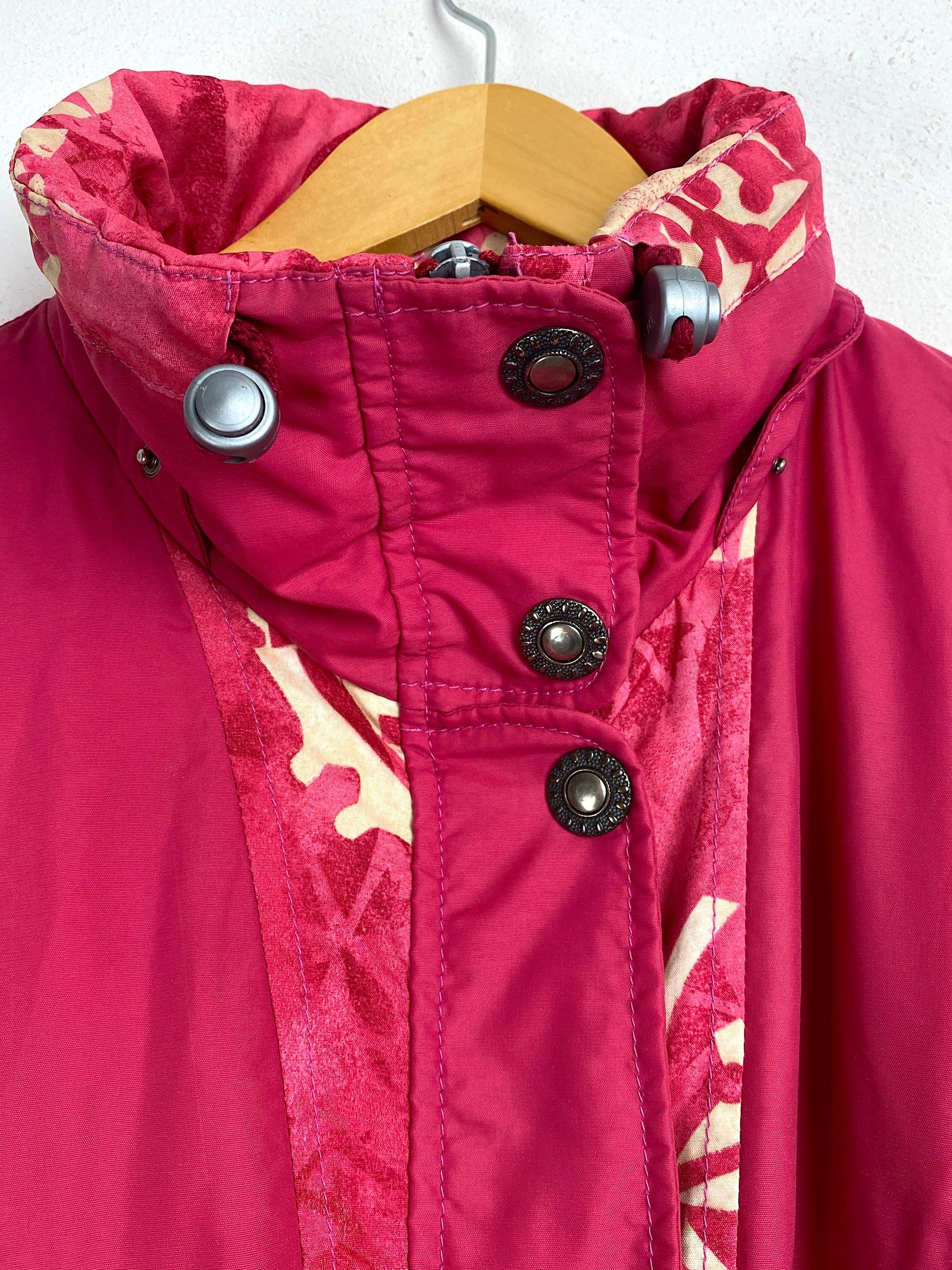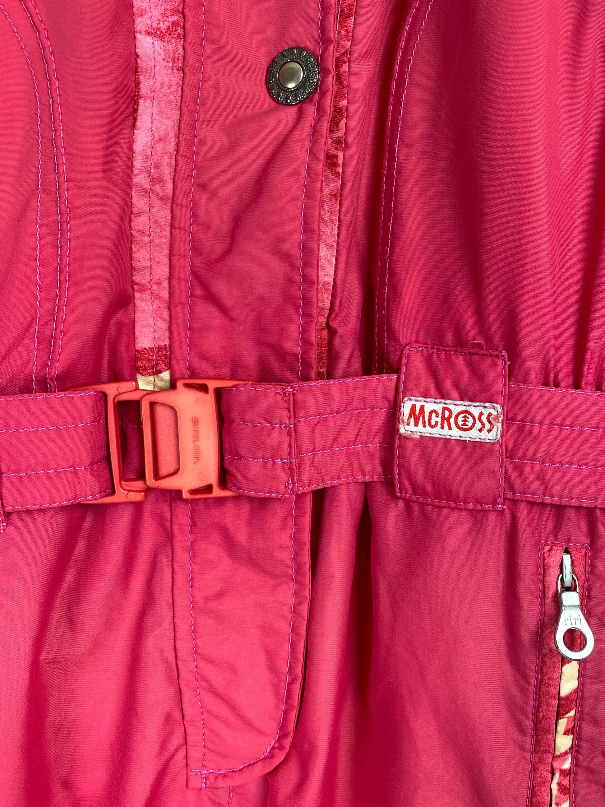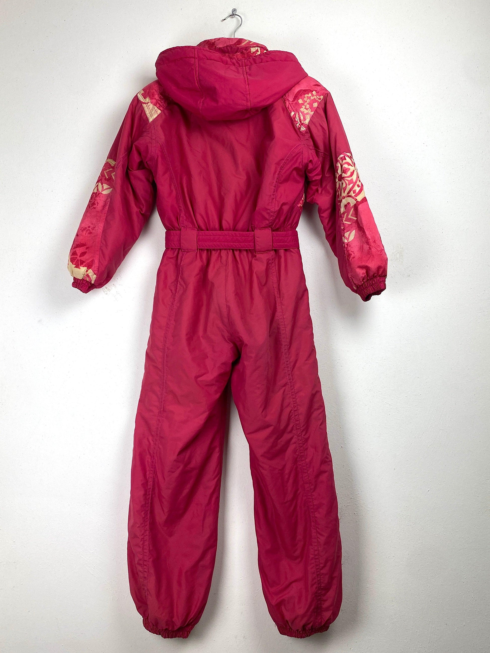 Retro-Skianzug für Kinder der Wintersportmarke McRoss mit Blumenmotiv. Zu öffnen mit Reißverschluss und Druckknöpfen. Gummizug an der Unterseite der Ärmel und Beine sowie in der Taille. Kapuze im Kragen. Inklusive Originalband. In einwandfreiem Zustand.